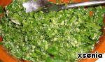 Делаем начинку. Мелко рубим зелень. Добавляем мелко порезанный чеснок + горчица + растительное масло и соль по вкусу.