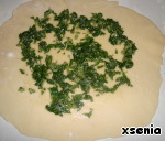 Тесто раскатываем в очень тонкие пласты (1 мм). Размером с вашу сковороду. Намажем один пласт начинкой.