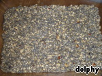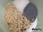 Смешайте муку, пекарский порошок, овсяные хлопья, кокосовую стружку, мак, сахарную пудру и 1/2 стакана орехов. Вообще этот коржик делается без мака с 1 стаканом кокосовой стружки, но у меня дома ее было только полстакана, поэтому я добавила мака. Получилось хорошо, так что вы можете действовать на свое усмотрение. -