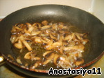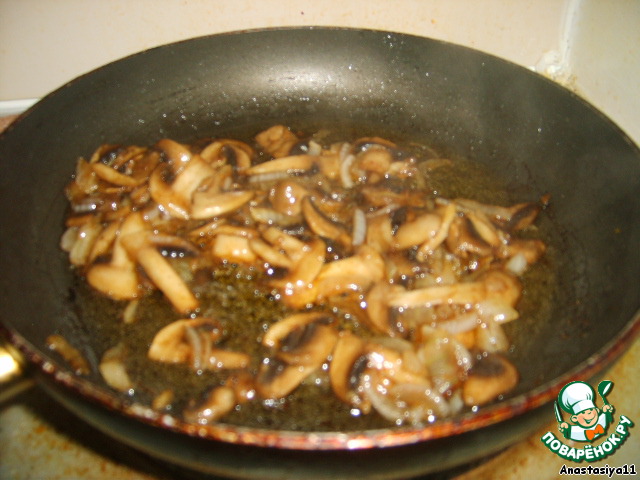 На разогретой сковороде обжарить лук 3 минуты, затем добавить грибы, обжаривать минут 5.