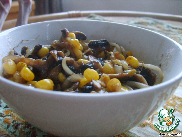 Туда же добавляем соевый соус, кукурузу и соевые ростки. Тушим парy минут.