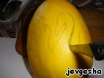 Нарисовать на дыне желаемый образ - птица, рыба.. И начать вырезать. Нож держать прямо.