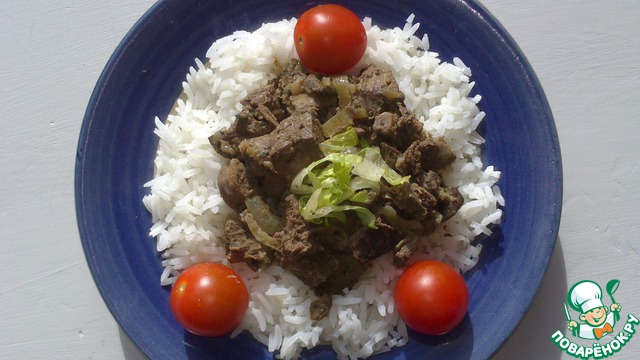 С печени снимаем плёнку, нарезаем и выкладываем в казан. Перемешиваем, оставляем тушиться ровно на 5 минут и выключаем под казаном огонь. Желательно крышку не открывать ещё минут 15.