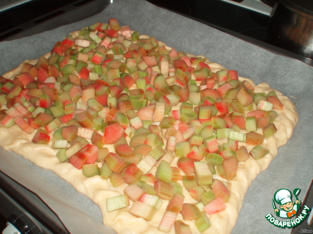 когда тесто на противне чуть поднялось, посыпаем густо ревенем и ставим в духовку при температуре 160 градусов примерно на 20 минут -