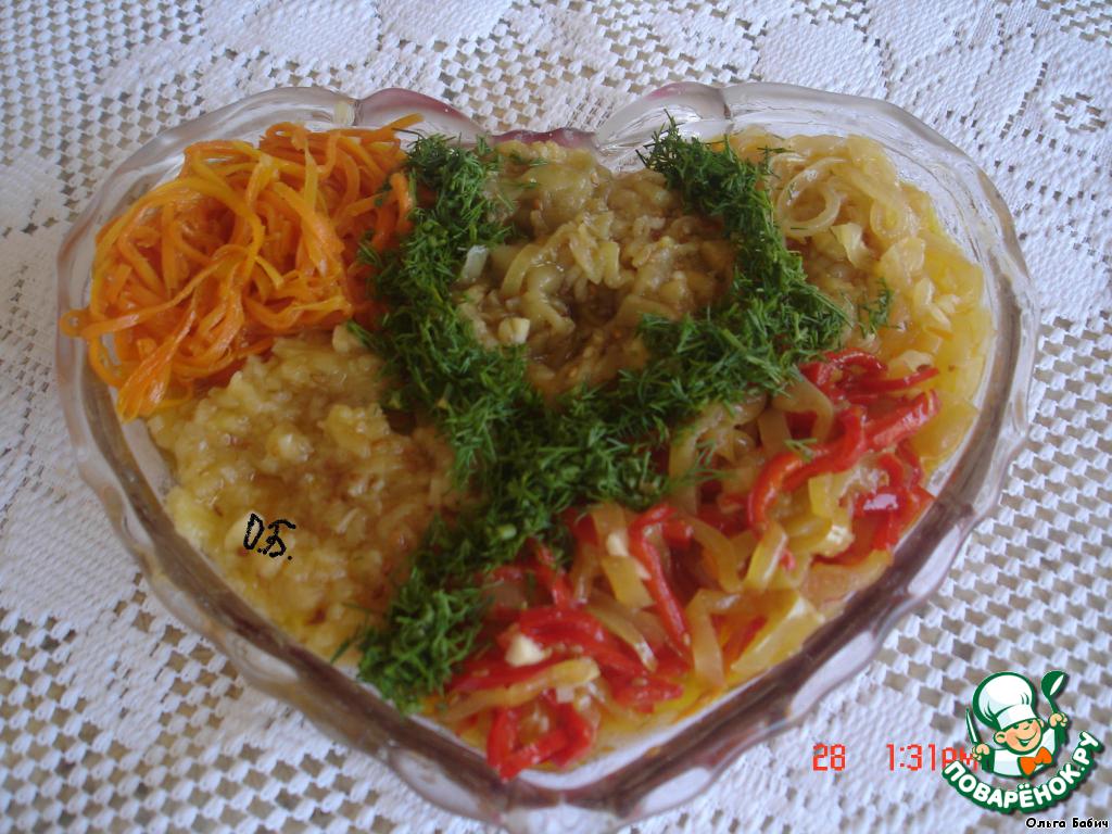 Морковь и картофель трем на терке для корейской моркови, лук режем кольцами, перец тонко полосками. Обжариваем все на растительном масле (без крышки, именно обжариваем, а не тушим! на большом огне!).