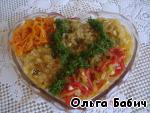 С овощей, сложенных на блюде, слить масло, довести до кипения, добавить кунжут, как только потемнеет - быстро снять и залить присыпанные чесноком овощи, посолить. |