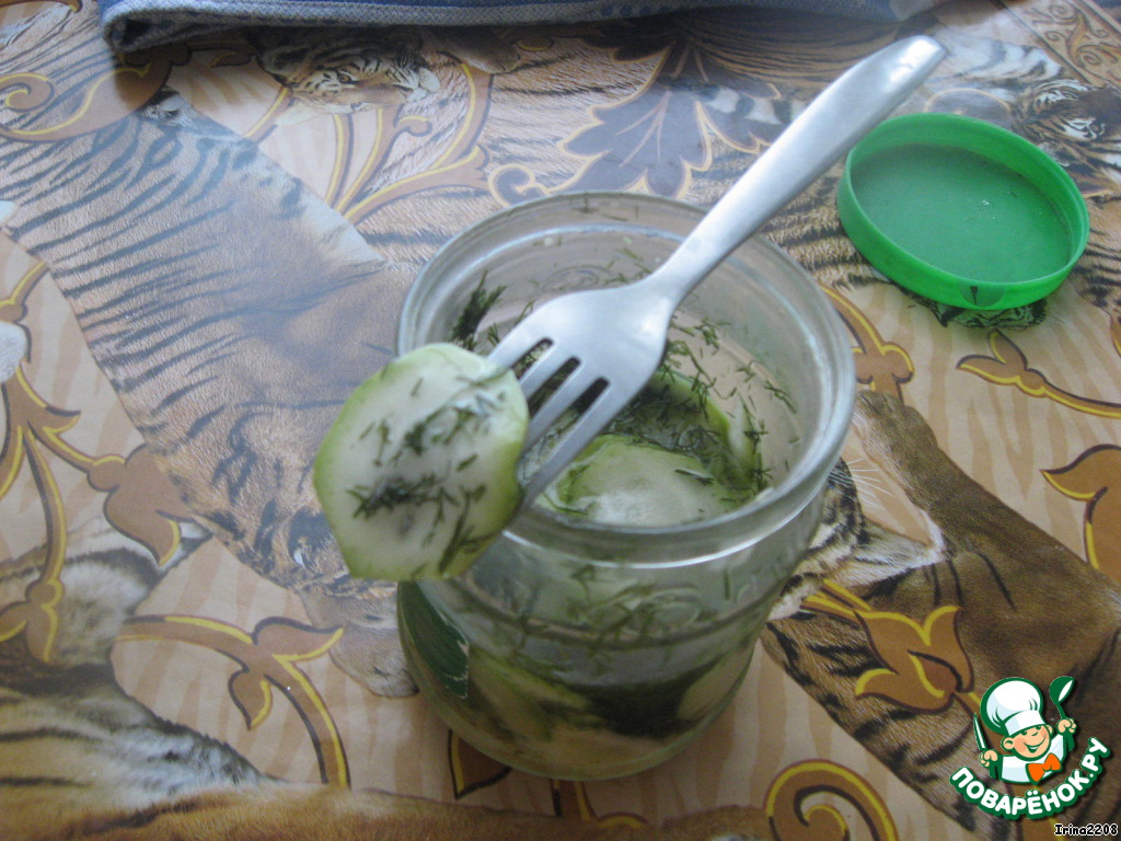 Затем отдельно смешиваем: растительное масло, соль, перец, уксус и укроп. Этот маринад - на 20-30 сек. в микроволновку и потом заливаем кабачки, встряхиваем банку и все! Через 2 часа можно кушать! У меня стояли примерно сутки, т. к. для меня - пусть получше промаринуется. Но все равно, согласитесь, очень ведь просто - 5 минут и все! -
