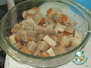Нарезать хлеб кубиками и смешать его с молочной смесью.