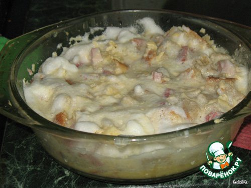 Добавить потертый сыр. Кусочками нарезанную ветчину. Дать немного постоять, чтобы хлеб пропитался, потом долить пиво.