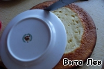 Далее складываем два коржа вместе и, чтобы вырезать луну, прикладываем тарелку подходящего диаметра и отрезаем по контуру.