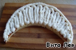 Когда крем начал схватываться, наносим его на нижний корж с помощью кондитерского шприца по контуру коржа и чуть в середине.