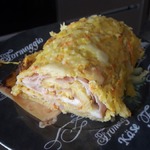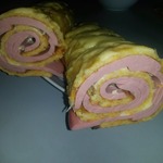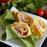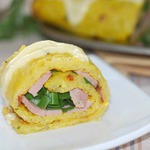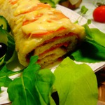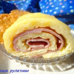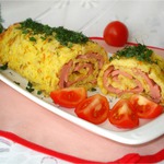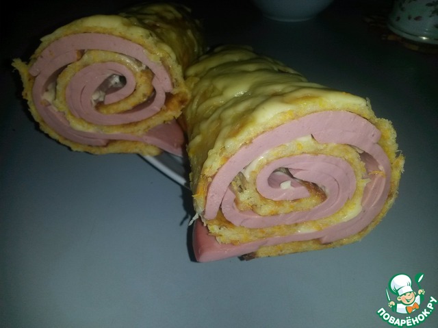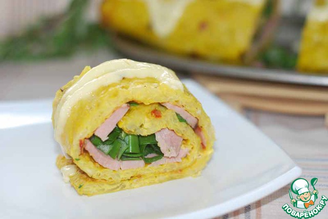 Сверху на рулет выложить тонкие ломтики ветчины. И свернуть рулетом. Можете пофантазировать: вместо ветчины выложить фарш, грибы, плавленый сыр... Все, что любите.