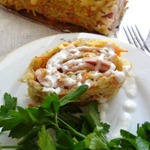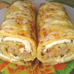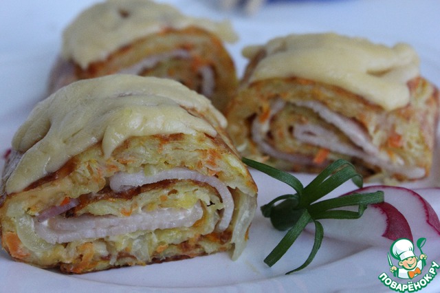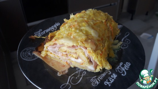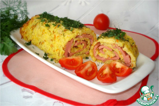 Девочки, наконец-то и я присоединилась к вам - я тоже достигла 5 -го уровня! По этому поводу предлагаю вам овощной рулет из картофеля, моркови и ветчины. Вариация на тему драников. Каждый может выбрать свой вариант начинки. Очень вкусно!