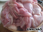 Готовить эти котлеты можно из дичи, индейки или курицы. По состоянию холодильника я выбрала последнее. Курицы там, правда, не оказалось, но зато были куриные бедрышки. Итак, мясо моем, отделяем от кости и режем на кусочки, вместе со шкуркой.