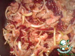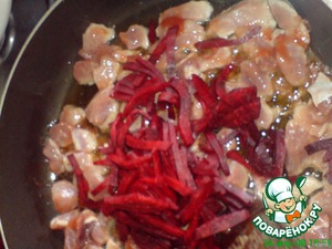 • Нарезать и обжарить на сильном огне свинину, к ней добавить нарезанную соломкой свеклу