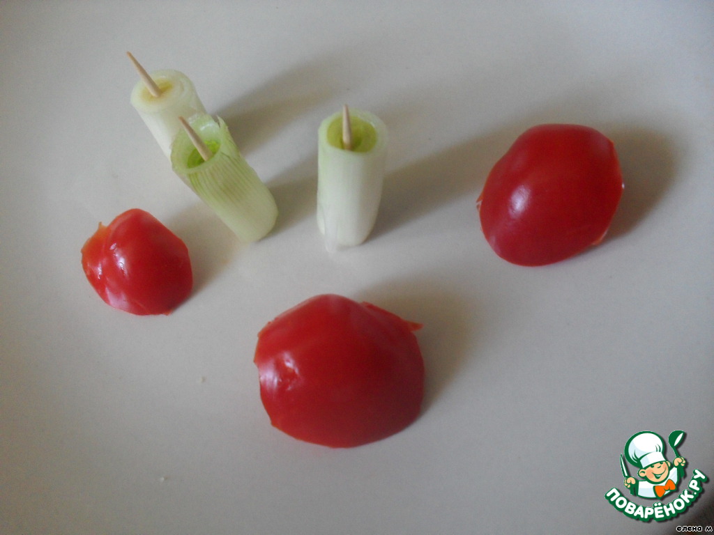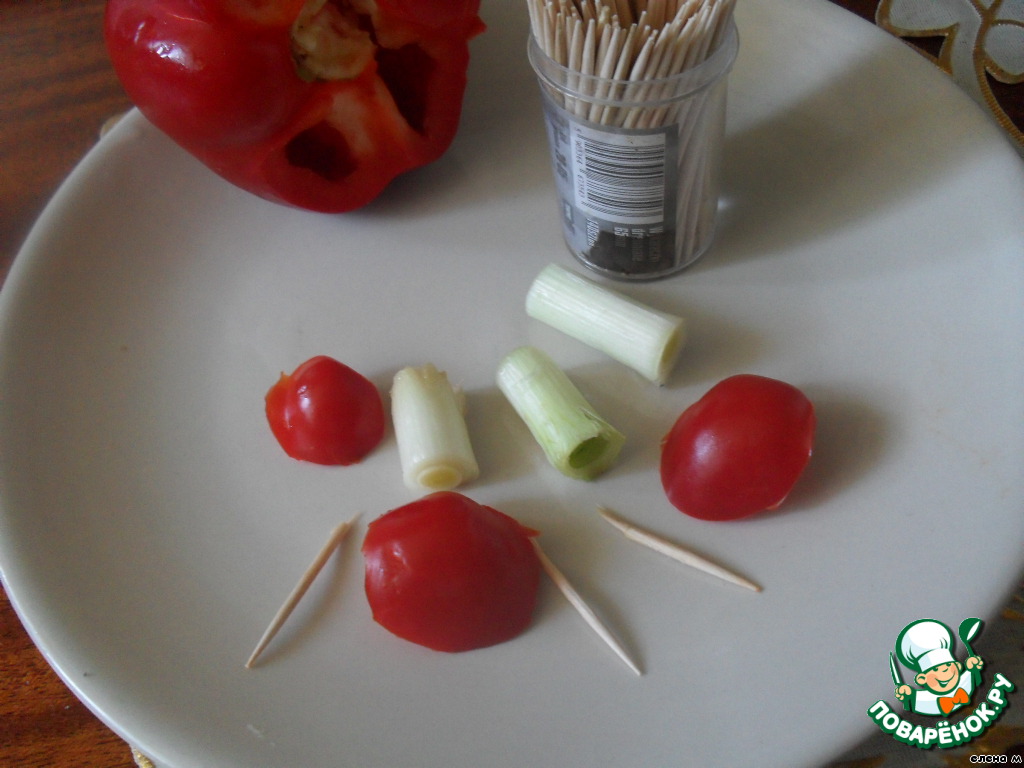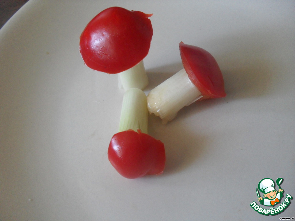 Шляпки грибочков вырезаем из болгарского перца (из бугорков около плодоножки). Ножки грибков - из белой части стебля зеленого лука. -