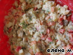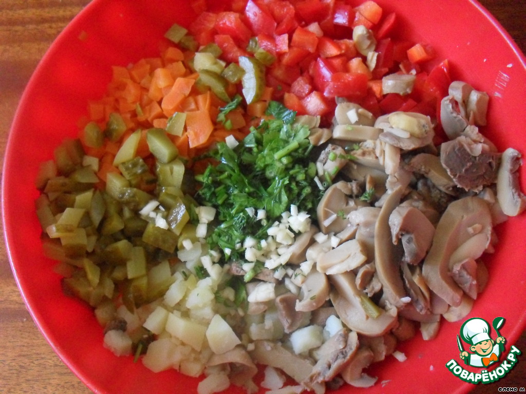 Теперь нарежем картофель, морковь, болгарский перец, корнишоны кубиками, добавим шампиньоны, мелко нарезанный чеснок и половину мелко нарезанной зелени укропа и петрушки.