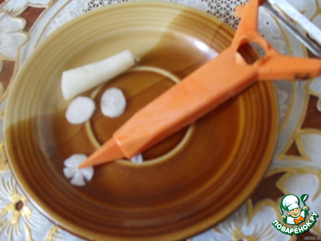 Из редиса, нарезанного тонкими кружками, ножом или овощечисткой (хвостиком для удаления глазков) вырезаем цветочки.