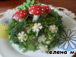 Ставим в центре грибочки, на шляпки с помощью деревянной зубочистки наносим точечки-пятнышки из майонеза.