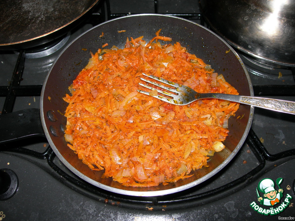 Пассируем до полуготовности лук и морковь, можно сюда добавить помидор (или ложечку соуса томатного или кетчупа). Сюда же кидаем зелени (у меня сушеная), солим, перчим, получается овощная "шуба".