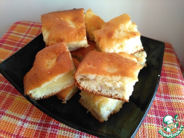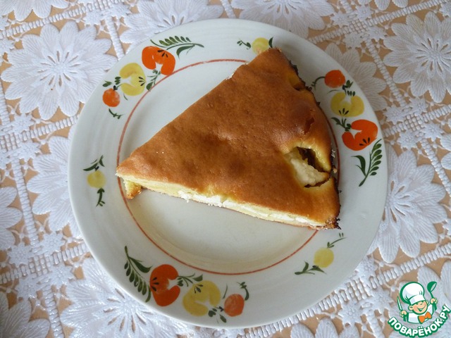 Смазать форму сливочным маслом и положить несколько кусочков масла на дно формы. Вылить одну треть теста в форму. На это тесто выложить порезанный колечками банан. На банан выложить творог небольшими кучками (чтобы он не был сплошным покрытием). Вылить все оставшееся тесто на творог. Выпекать при 220 гр. мин. 30, до зарумянивания.