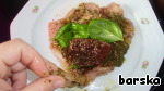 Mаринованный шницель смазать соусом песто и выложить на него сушеный помидор.
