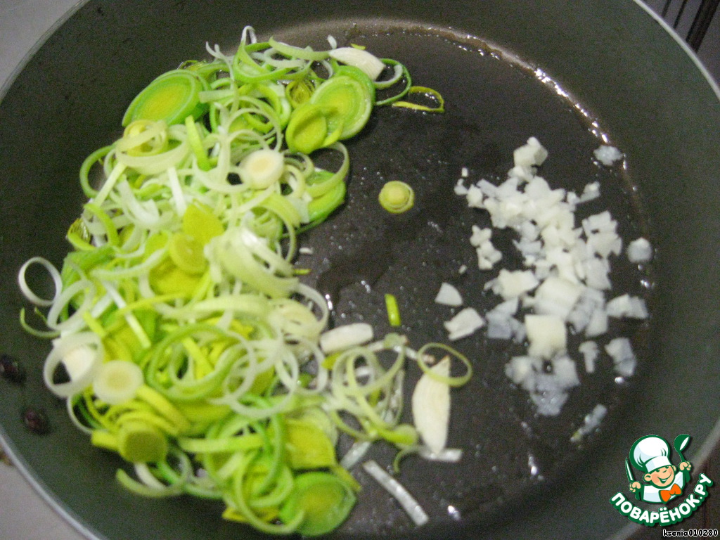 Лук порей нарезать кольцами, чеснок мелко ножом и обжарить все на сливочном масле до золотистого цвета. В конце добавить молотую паприку.