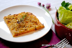 После 10 минут выпечки по тесту распределить ровным слоем лук и выпекать еще 15 минут.