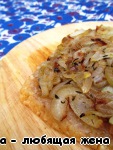 После 10 минут выпечки по тесту распределить ровным слоем лук и выпекать еще 15 минут.