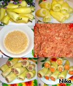 Рис хорошо пролетит до самого дна. В перчик положить столовую ложку риса, затем добавить фарш.