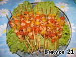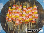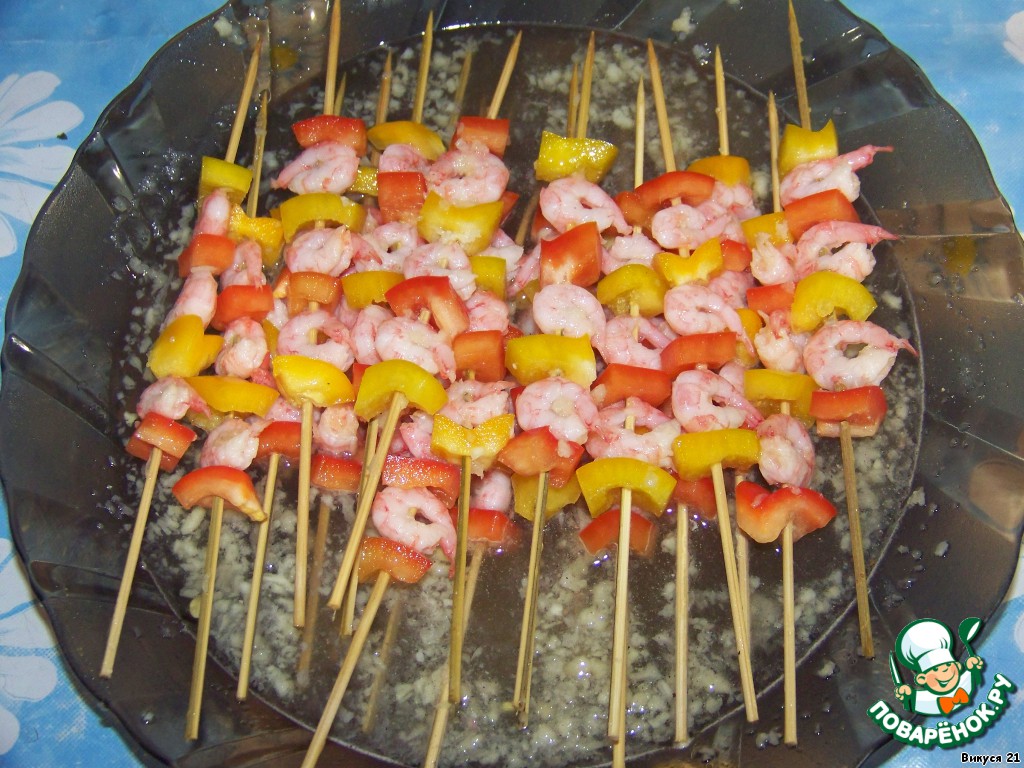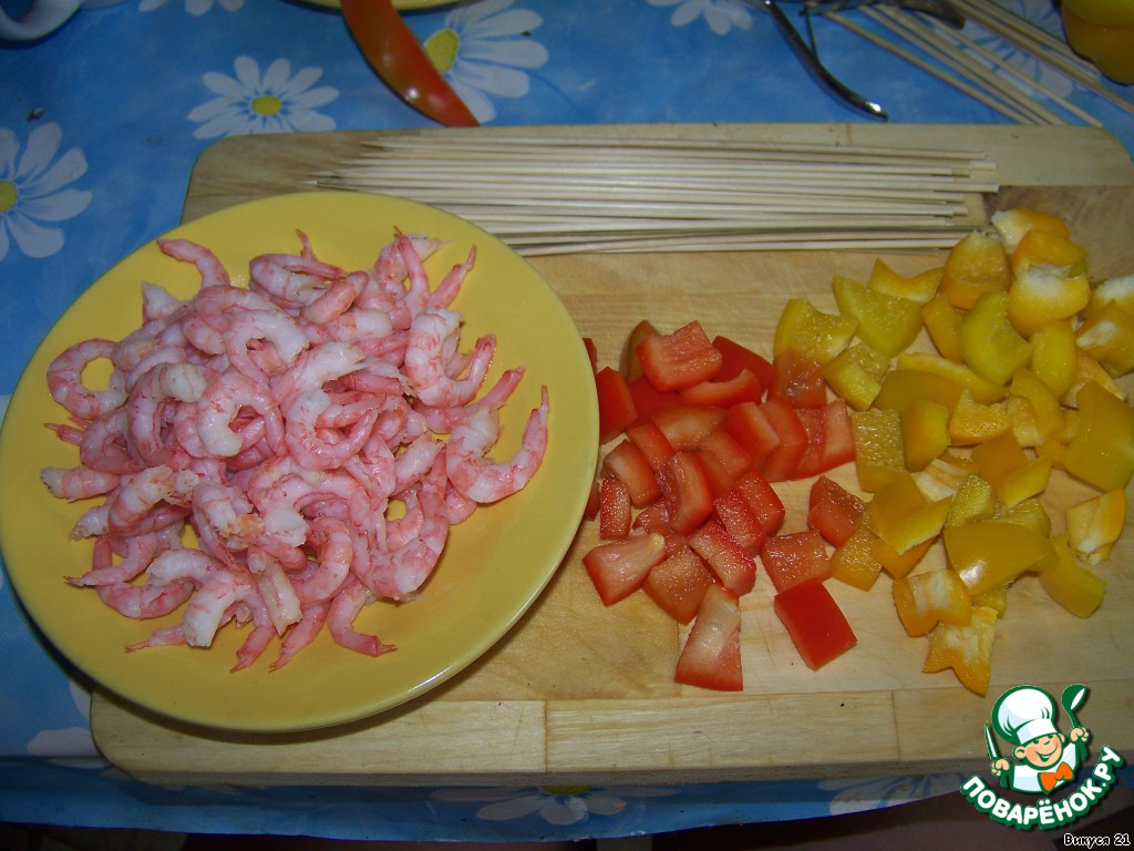 Нанизываем на шпажку перец, чередуя с креветкой - дело кропотливое, но результат того стоит.