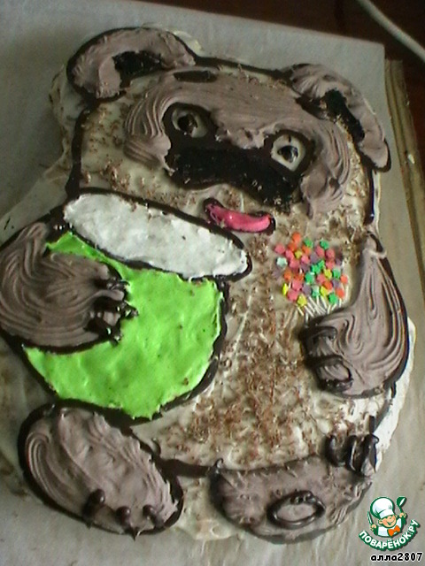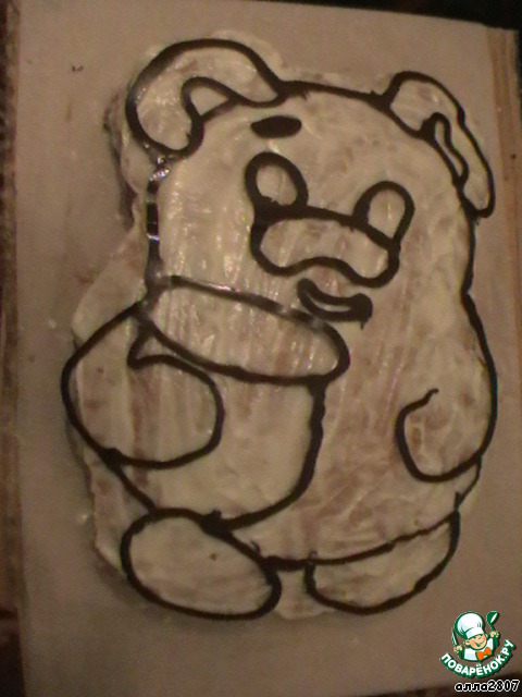 Нарисовать Винни-пуха или на рисунок положить кальку и обвести карандашом. Растопила шоколадную глазурь и из корнетика сделала тонкий контур прямо на кальке или на пленке. Застывший контур перевернуть на поверхность торта и аккуратно снять кальку. Заметьте, что я не все обвела, а только сложные контуры. Остальное дорисовала (когти, бровки...) Это очень просто. -
