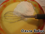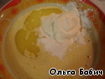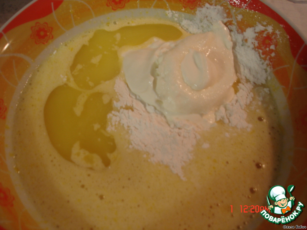 Добавить растопленное, но охлажденное масло, разрыхлитель и сметану, хорошо перемешать.