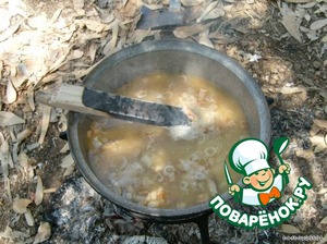 Если мясо и картофель готовы, добавляем кускус и варим минут 10-15, постоянно помешивая, чтобы кускус не пригорел, берем горящее полено и опускаем в кашу