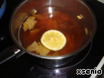 Добавим корицу, гвоздику и кардамон. Варим на слабом огне 20 минут, добавляем половину лимона (сок выжмите и добавьте лимон вместе с коркой).