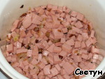 Почистить морковь и нарезать кубиками, добавить к колбасе и луку. НЕ МЕШАТЬ!