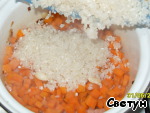 Промыть рис и добавить к моркови следующим слоем. Предварительно на морковь положить чеснок. НЕ МЕШАТЬ! Посолить.