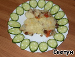 Сверху выложить оставшийся картофель и посыпать сыром.