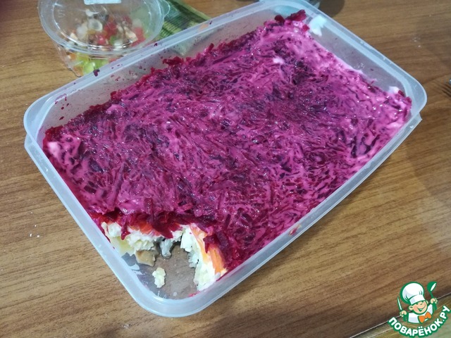 И последним слоем выкладываем очищенную и натертую тоже на крупной терке свеклу. Иногда я меняю последние два слоя местами, чтобы салатик и на вид отличался от селедки под шубой (ведь ингредиенты все те же самые) - получается очень интересный рыженький салатик - своеобразная \'Лисья шубка\'. *JOKINGLY*