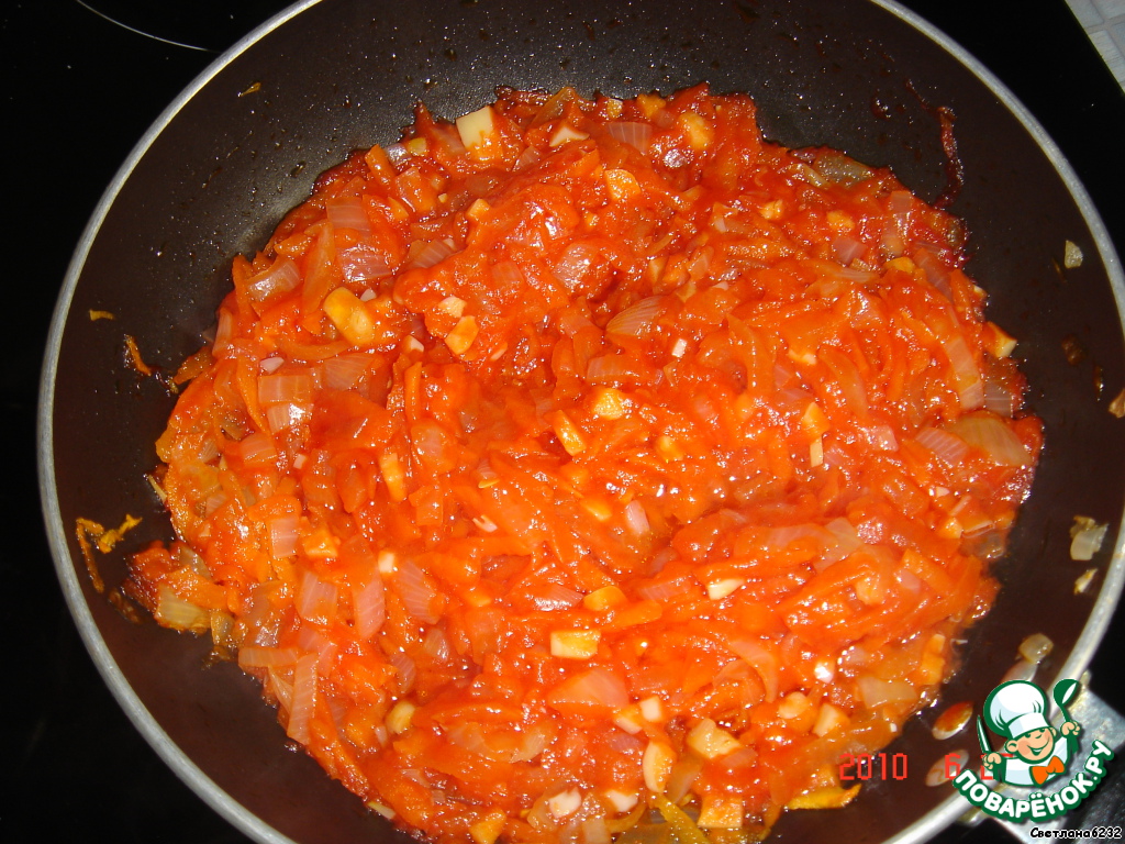 3. Лук и морковь нашинковать соломкой, обжарить на растительном масле до золотистого цвета. В конце добавить измельченный чеснок и томатную пасту, потушить 2-3 минуты.