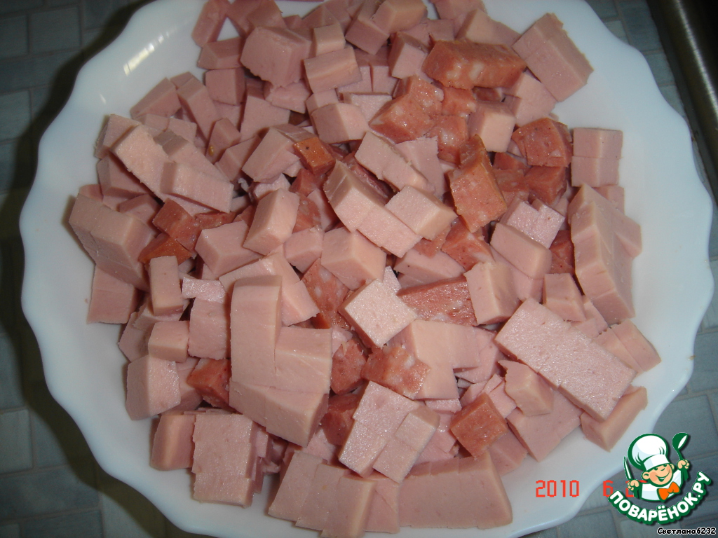 1. Окорочок отварить, остудить и нарезать мелкими кусочками.