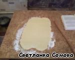 тесто раскатать в пласт шириной 25 см, поверхность пласта равномерно посыпать сахаром.