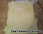 тесто раскатать в пласт толщиной 1 см, сложить его вчетверо, раскатать, снова сложить вчетверо и раскатать.
