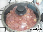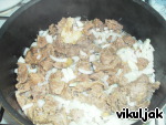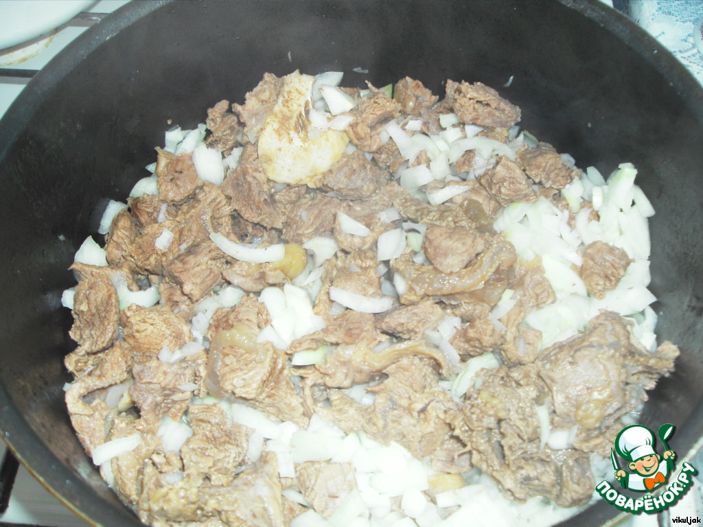 Когда мясо будет готово, бульон вылить в отдельную посуду, а в мясо добавить мелко нарезанный лук и тушить. Бульон добавлять по необходимости, чтобы лук не подгорел.