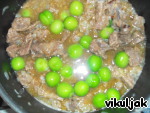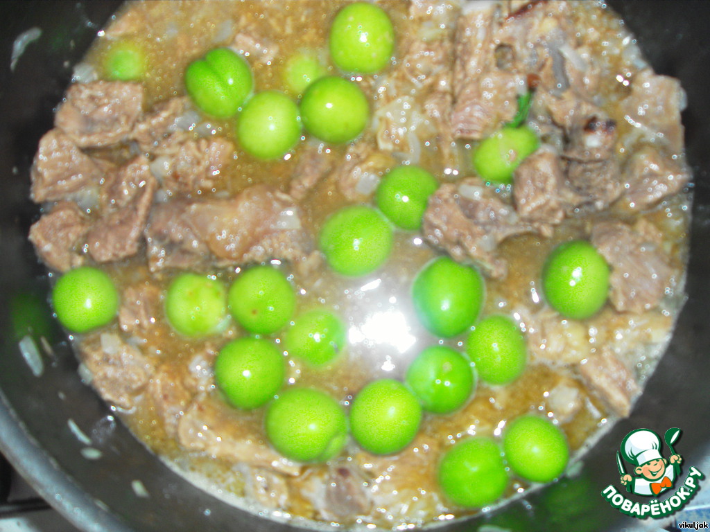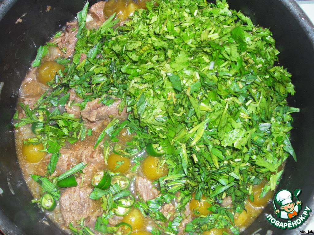 Когда лук будет готов, добавить бульон, столько, чтобы мясо не накрылось полностью. Затем добавить ткемали, затем вино и варить примерно минут 5, пока ткемали не станет мягкой.
