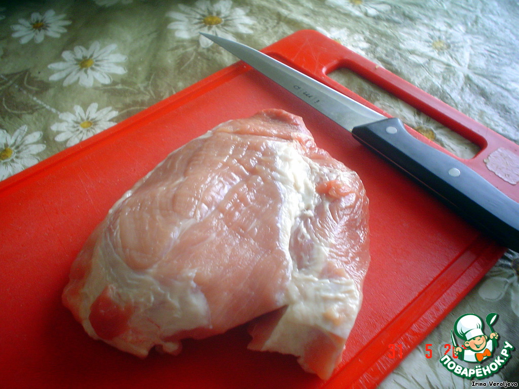 Острым ножом сделать нарезки на мясе, куда надо будет вложить много чего вкусного! Прорези делаем примерно через 1 см.