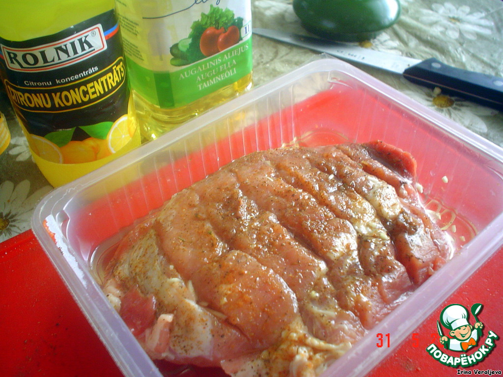 Наш кусок мяса кладем в емкость, где и будем мариновать его. Обливаем растительным маслом и соком половинки лимона (или 1 ст. ложкой лимонного концентрата, что у меня и было) -