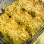 Смешиваем желтки + сметана + сыр. Заливаем смесью блины и ставим в разогретую до 200 градусов духовку на 15-20 минут.