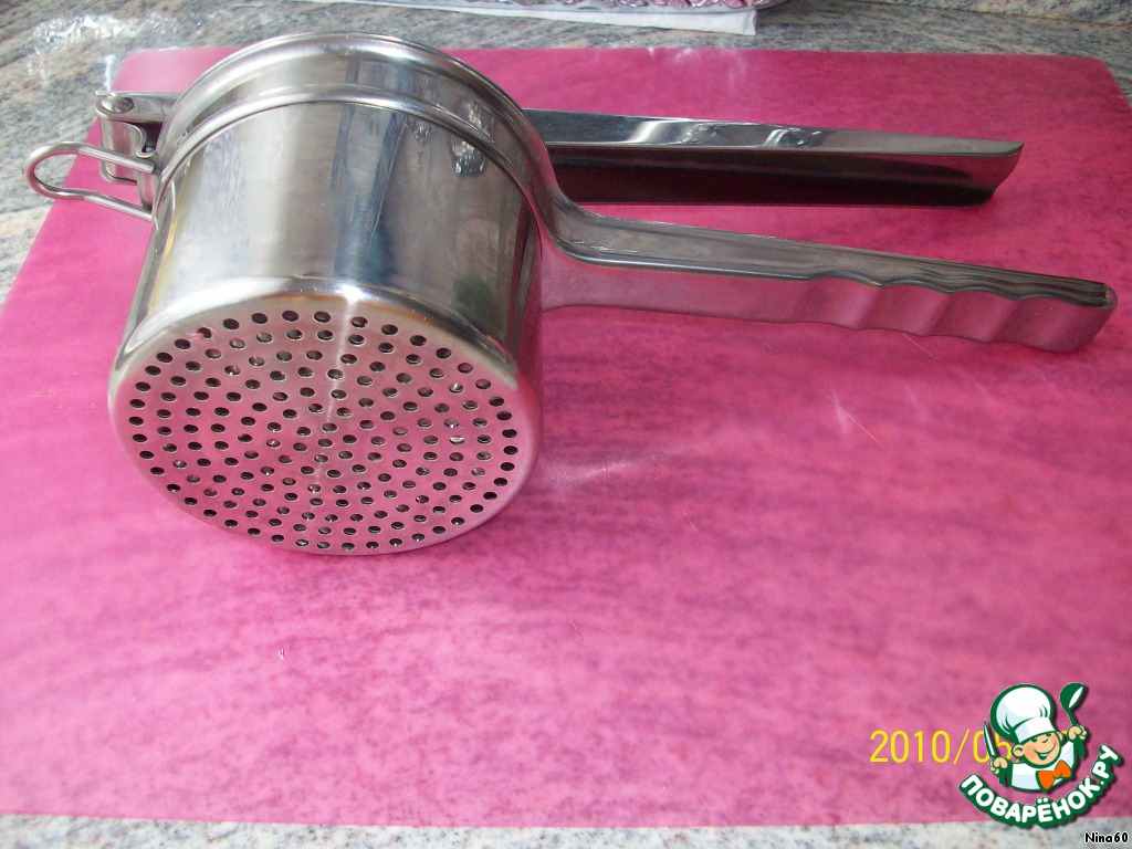 Выложила в этот пресс и выдавила в кипящую подсоленную воду. Затем откинула в дуршлаг. -