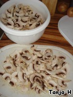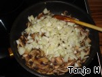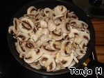 На ту же сковороду льем 2 ст.л. масла и выкладываем нарезанные шампиньоны. Начинаем обжаривать на среднем огне.